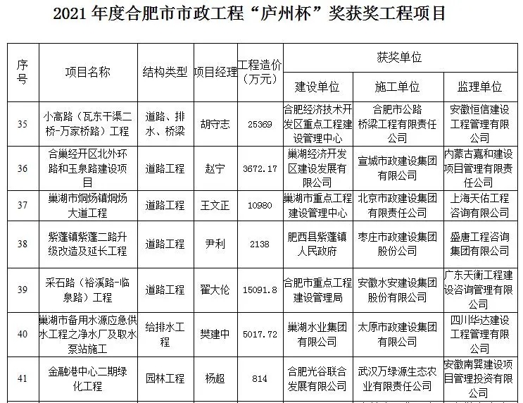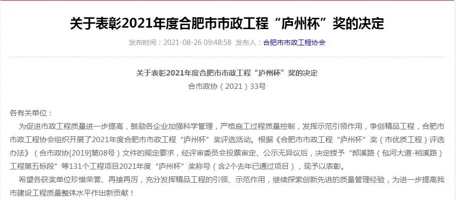 此獎的獲得,是合肥市人民政府、合肥市市政工程協(xié)會對集團公司承建工程質(zhì)量的充分肯定,集團公司將繼續(xù)嚴格把控工程質(zhì)量,高標準、高要求狠抓項目精細化管理,力爭打造更多優(yōu)質(zhì)工程。